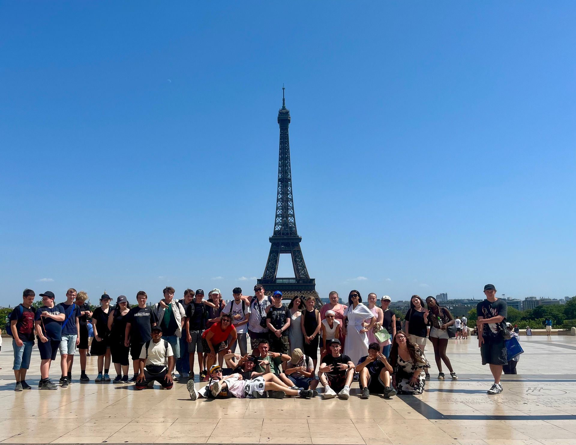 Am 01.07.25 starteten wir, die Klassen 9a und 10b, in den frühen Morgenstunden zu einem Ausflug nach Paris. Trotz der angekündigten Hitze bestiegen wir den TGV, um ca. 2 ½ Stunden später mitten in Paris, am Gare de l‘Est anzukommen. Von dort ging es zu Fuß zu unserem ersten Ziel, dem Centre Pompidou, wo wir die Kunstwerke von Jean Tinguely und Niki de Saint Phalle bestaunten. Dieser erste Eindruck von Paris war schon sehr schön. Aber es wurde noch besser, als wir die Kathedrale Notre-Dame erreichten, die wir von außen betrachteten. Weiter ging es zum Louvre, welchen wir allerdings nicht von innen besichtigten. Mittlerweile waren die angekündigten Temperaturen erreicht und die große Hitze zwang uns zu einer Pause in den Jardins des Tuileries. Einige Unerschrockene nutzten diese Pause, um die Champs-Elysées zu erkunden. Natürlich durfte auch eine Fahrt mit der Metro nicht fehlen. Diese brachte uns zum Eiffelturm, dem Highlight unseres Tages. Nach einigen Fotos und Souvenirshopping fuhren wir wieder zum Bahnhof. Von dort führte uns unsere Reise zurück nach Karlsruhe. Nach über 20.000 Schritten, durchgeschwitzt und erschöpft, aber voll mit großartigen Momenten und Erinnerungen, an einen Tag, der Lehrern wie Schülern lange im Gedächtnis bleiben wird.
