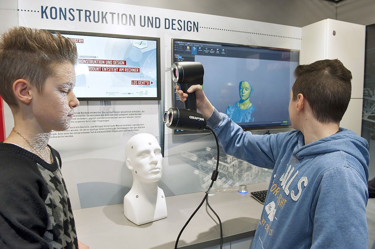 Um Jugendlichen Lust zu machen, an diesem spannenden Thema mitzuarbeiten, ist die mobile Industriewelt DISCOVER INDUSTRY – CHANCEN | BERUFE | ZUKUNFT im Rahmen des erfolgreichen Programms COACHING4FUTURE in Baden-Württemberg unterwegs. Das gemeinsame Angebot der Baden-Württemberg Stiftung, des Arbeitgeberverbands Südwestmetall und der Regionaldirektion Baden-Württemberg der Bundesagentur für Arbeit macht vom 14. bis 15. Februar an der Schillerschule in Ettlingen Station. 3D-scannen, programmieren, smart produzieren: Zu Beginn des Workshops zeigt ein multimedialer Rückblick, wie der gesellschaftliche und technische Fortschritt die industrielle Entwicklung immer mehr beschleunigte. Wie die effiziente Serienproduktion heute erfolgt und welchen Einfluss die digitale Transformation weiter nehmen wird, finden die Schulklassen an fünf Meilensteinen des Produktentstehungsprozesses und weiteren Exponaten heraus. Unter Anleitung der Coaches Dr. Judith Flurer und Industriemeisterin Jaqueline Pernet verwandeln die Jugendlichen zum Beispiel mithilfe eines 3D-Scanners einen Prototyp in ein Computermodell. Ein Roboterarm kann mittels Koordinaten-Eingabe punktgenau gesteuert werden. Und wenn die Mädchen und Jungen ihr selbst konfiguriertes Produkt durch die intelligente Produktionsanlage lotsen, bekommen sie bereits einen Ausblick auf die „Smart Factory“ von morgen. Im Obergeschoss werden Bildungswege und Aufgabengebiete verschiedener MINT-Berufe aufgezeigt. Die mobile Industriewelt möchte so die vielseitigen Berufsmöglichkeiten in der Industrie praxisnah und anschaulich vermitteln.